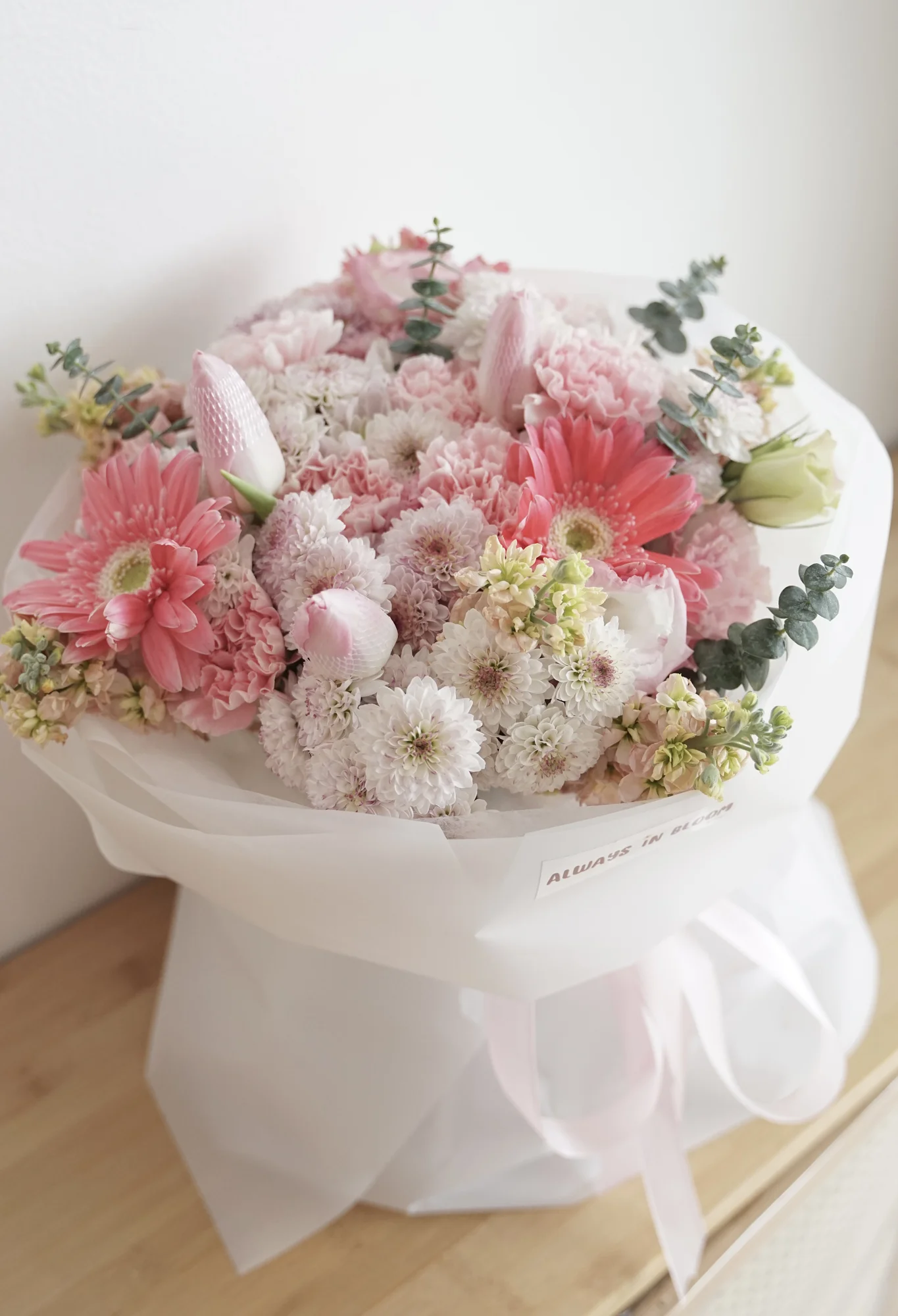 This luxurious, full-bodied bouquet features a variety of stunning blooms in soft pink and white tones. It includes fluffy white and light pink chrysanthemums, striking pink gerbera daisies, elegant white tulips, and delicate pink filler flowers. Sprigs of eucalyptus provide a fresh, green contrast. Expertly wrapped in clean white paper and secured with a soft pink ribbon, it exudes feminine charm.
